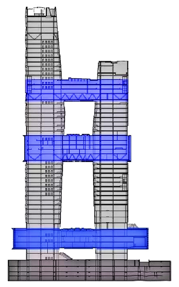 腾讯滨海大厦的组织架构在水平和垂直方向上均最大化地实现了视觉和空间的连通。两座塔楼由三个位于不同高度的天桥连接,被戏称为三条“腰带”。